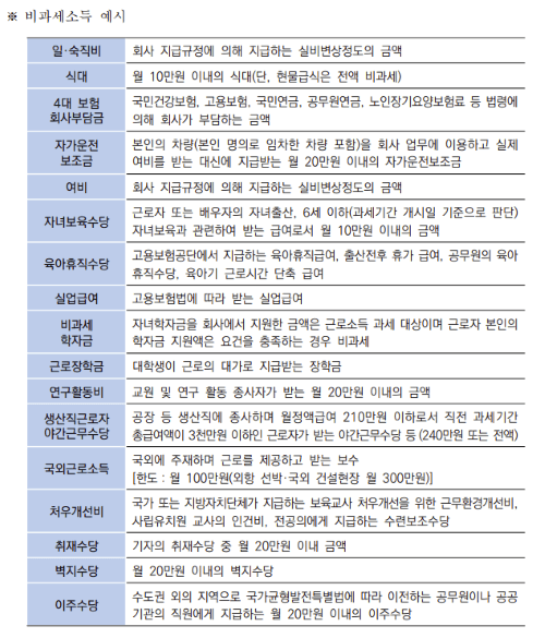 ⑤ 비과세소득 : 법률에 의해 과세 요건을 제외하는 소득을 말한다. (2023. 1. 1.부터 식대 20만 원으로 상향)