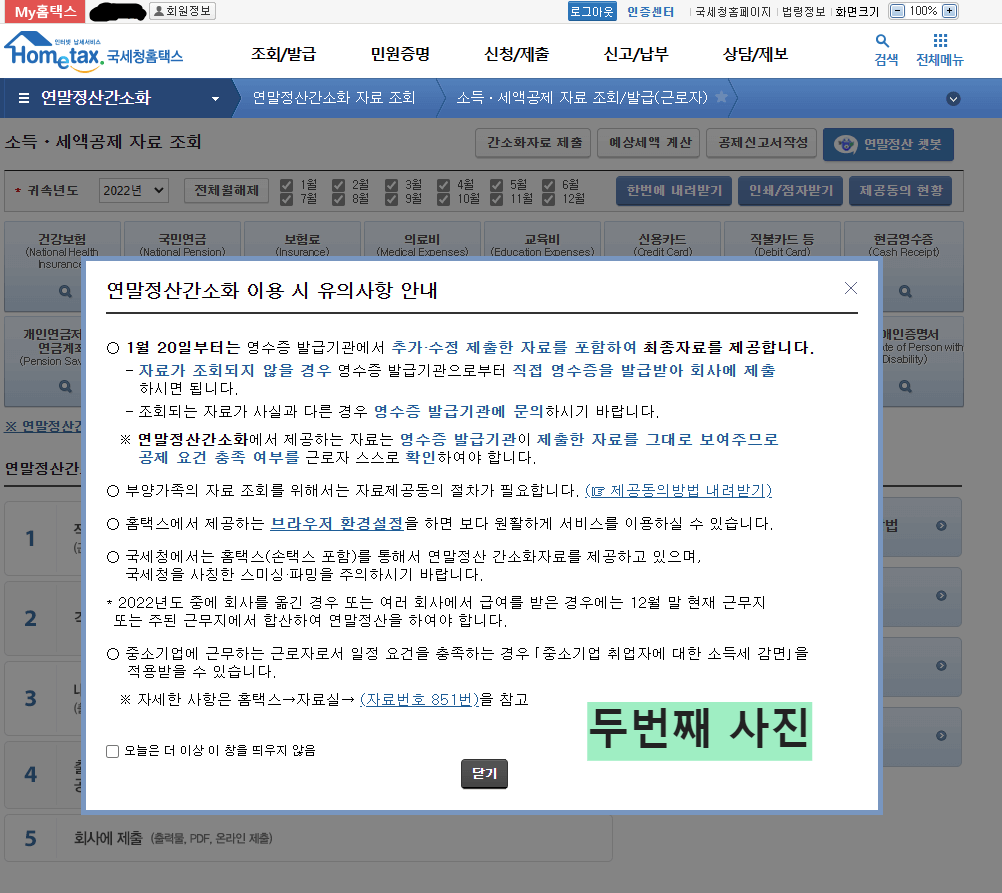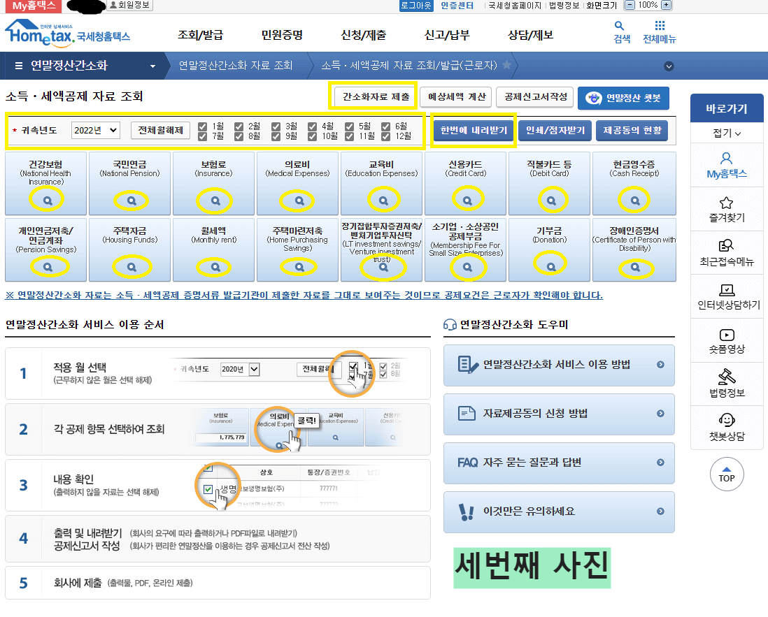"조회/발급"을 클릭하면 첫 번째 사진처럼 연말정산간소화 화면이 나옵니다.