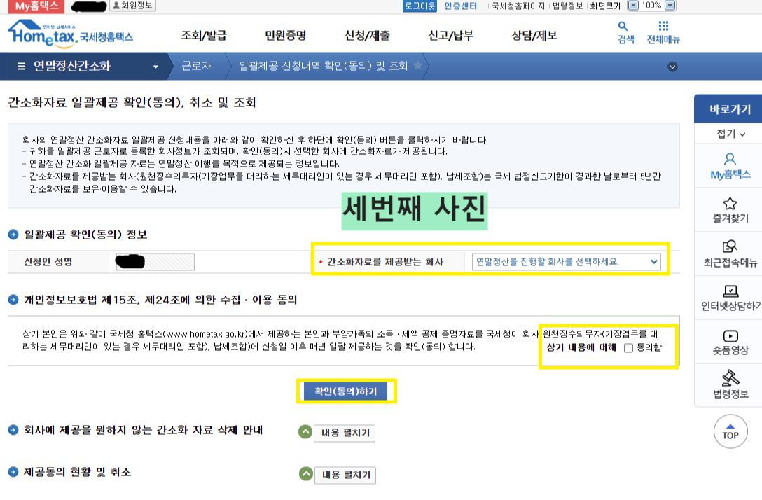 세 번째 사진을 보면 본인 이름이 나오고 옆에 "간소화 자료를 제공받는 회사"가 나오는데 자신의 회사를 선택하고 확인 동의 하시면 됩니다. 아직 회사등록이 안 돼있으면 뒤로 가기로 나가서 첫 번째 사진의 "자료제공 동의 신청"을 클릭하시면 네 번째 사진처럼 화면이 나옵니다. (회사등록이 되어있으면 홈택스 사이트에서 바로 공제 자료를 회사로 제출할 수 있으며, 등록이 안되어 있으면 공제 자료를 내려받기해서 회사 메일로 직접 보내시면 됩니다.)