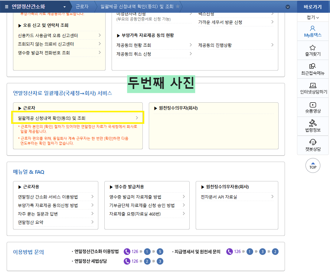 화면을 아래로 내리면 두 번째 사진에서 보이는 "일괄제공 신청내역 확인 및 조회"를 클릭합니다.