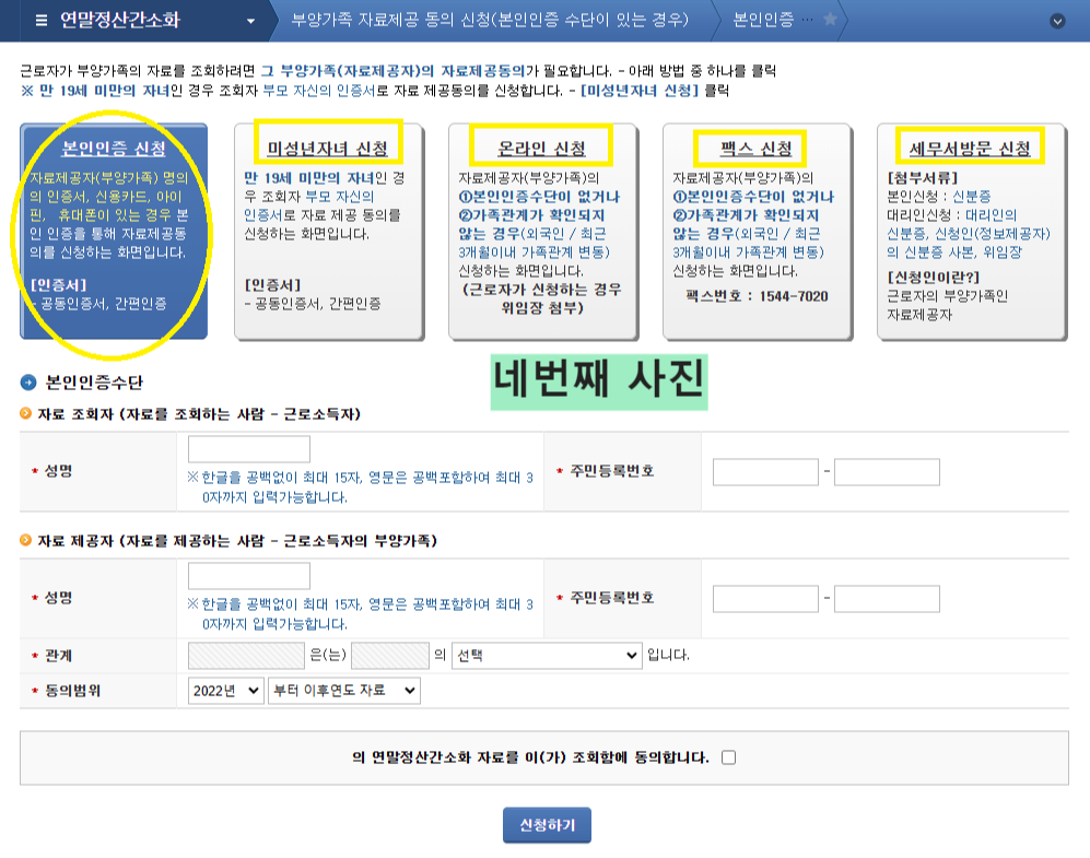 이 네 번째 화면에서 부양가족 동의 신청을 작성하시면 됩니다. 부양가족 동의를 신청할 때 네 번째 사진에서 보듯이 다섯 가지 방법이 있는데 보통 본인인증 신청 방법으로 많이 하고, 미성년자녀가 있으면 미성년자녀 신청으로 하시면 됩니다.