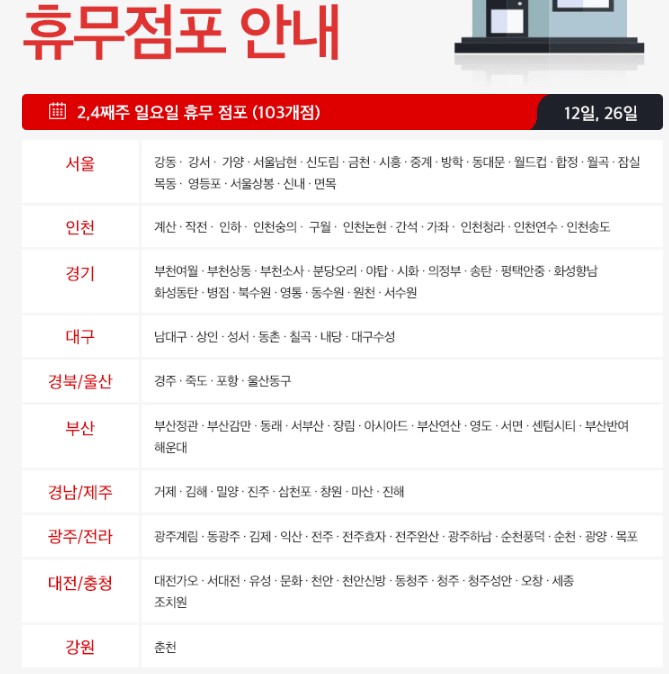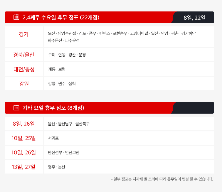 2) 휴무일 : 대부분 점포들은 매월 둘, 넷째 주 일요일 쉽니다. ( 일산점 : 매월 둘, 넷째 수요일 휴무 / 울산점 : 매월 둘째 수요일, 넷째 일요일 휴무)